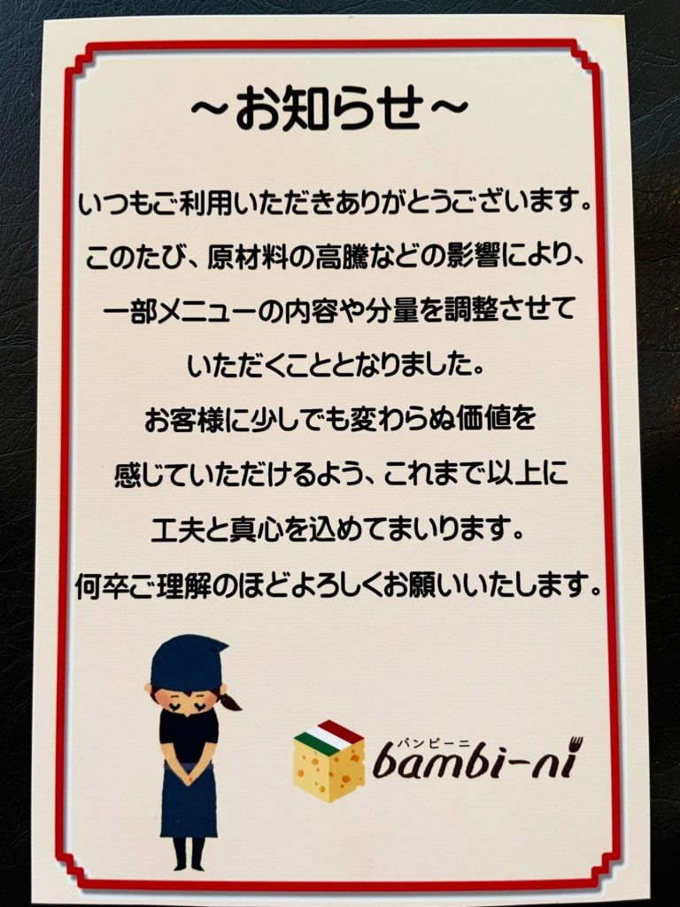 この度、原材料の高騰により一部メニューの内容や分量を調整させて頂く事になりました!